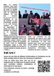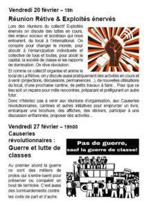 Donc n’hésitez pas à venir aux réunions d’organisation, aux Causeries révolutionnaires, cantines et autres initiatives pour emprunter un livre, embarquer une brochure, des affiches, des stickers, participer à une discussion enflammée, proposer des activités…