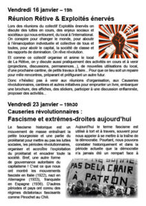 Donc n’hésitez pas à venir aux réunions d’organisation, aux Causeries révolutionnaires, cantines et autres initiatives pour emprunter un livre, embarquer une brochure, des affiches, des stickers, participer à une discussion enflammée, proposer des activités…