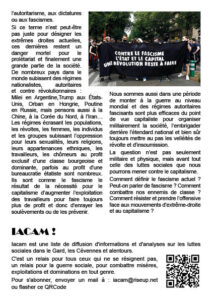 Si ce terme n’est peut-être pas juste pour désigner les extrêmes droites actuelles, ces dernières restent un danger mortel pour le prolétariat et finalement une grande partie de la société. De nombreux pays dans le monde subissent des régimes nationalistes, autoritaires et contre révolutionnaires : Milei en Argentine,Trump aux États-Unis, Orban en Hongrie, Poutine en Russie, mais pensons aussi à la Chine, à la Corée du Nord, à l’Iran… Les régimes écrasant les populations, les révoltes, les femmes, les individus et les groupes subissant l’oppression pour leurs sexualités, leurs religions, leurs appartenances ethniques, les travailleurs, les chômeurs au profit exclusif d’une classe bourgeoise et dominante, parfois au profit d’une bureaucratie étatiste sont nombreux. Ils sont comme le fascisme le résultat de la nécessité pour le capitalisme d’augmenter l’exploitation des travailleurs pour faire toujours plus de profit et donc d’enrayer les soulèvements ou de les prévenir.